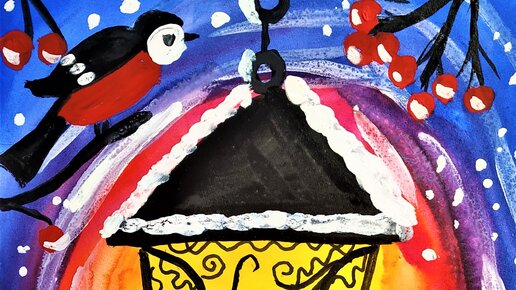 Друзья, этот зимний рисунок рисовать просто. Рисуем акварелью, белой, красной гуашью. А чугунные узоры на фонаре можно рисовать черным фломастером.