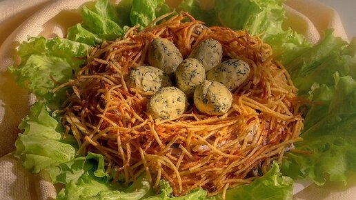 Оригинально оформленный салат “Гнездо глухаря” может украсить любой праздничный стол, например новогодний стол, а гости будут восхищаться его видом и вкусом. Такое вкусное и красивое блюдо можно смело добавить в новогодние рецепты. Салатик возможно готовить с различным составом продуктов, в зависимости от предпочтений. А оформляют его примерно одинаковы все кулинары, с небольшими интерпретациями, или попроще на каждый день или как праздничные блюда. Если хотите ускорить процесс приготовления, можно использовать картофель фри или картофельные чипсы, кому что больше нравится...