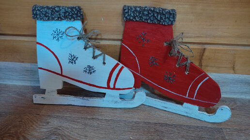 Пора уже начинать украшать дом к праздникам, но на улице морозно, выходить не охота. Решила придумать ещё какую-нибудь декорацию. Это будут коньки😊. Выпилила и просверлила нужные отверстия. Всё ошкурила. Из кусочков сшила опушку на верх конька. Покрасила, но надо как-то украсить. Лезвия оттенила серебрянным воском...