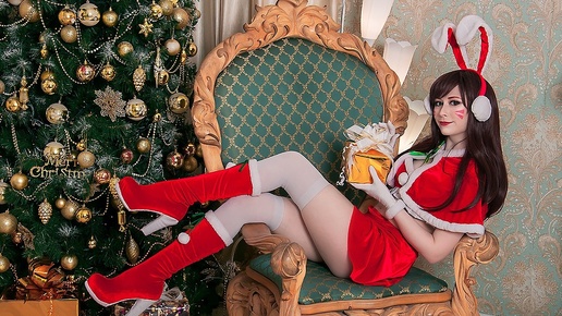 Новогодний косплей D.Va из Overwatch под ёлкой