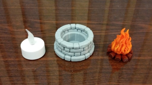 Увидел интересную модельку костра, Очень понравился. Вполне можно и " Братьев 12 месяцев" вокруг посадить. Сделал 2 варианта, мини и в оригинальном размере. Мини вариант- В оригинальном размере, высоте 17см. Для мини варианта, чтоб можно было всунуть подсветку напечатал "каменную" подставку. В качестве подсветки, использовал обычную светодиодную свечку. Там диодик ещё и подмигивает, таким образом создается полная иллюзия что костер живой... Свечку использовал диаметром 37.5мм. Масштаб костра 31%...