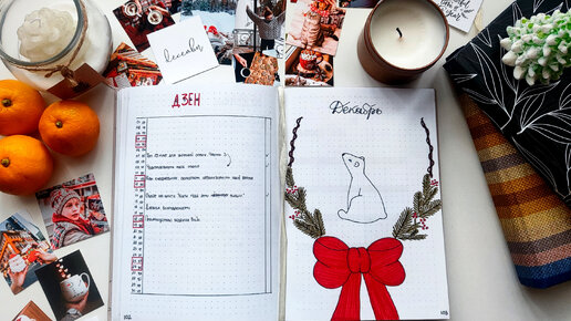 Самый волшебный месяц в году уже на пороге и стучится в двери. ✨ К оформлению декабря я подошла основательно и постаралась учесть и собрать всё необходимое в одном месяце. Так же я добавила один новый разворот и он мне страсть как нравится.🤗 Но об этом немного позже, а сейчас начну рассказывать всё по порядку. Поехали ☺️ В этом месяце я целенаправленно решила отказаться от наклеек на титульном листе и оформить его от руки. Вдохновившись, на других каналах, оформлением прошлых лет, захотела нарисовать мишку сидящего внутри венка из ели...