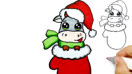 Первый рисунок будет миленький бычок в новогодней одежде, который сидит в варежке.
