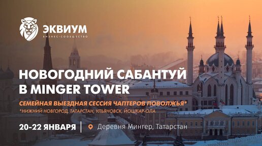 20-22 января 2023 года приглашаем вас на «Новогодний сабантуй в Minger Tower» — зимнюю семейную выездную сессию бизнес-сообщества «Эквиум» чаптеров Поволжья: Нижний Новгород, Татарстан, Йошкар-Ола, Ульяновск.