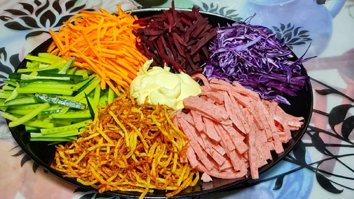 Друзья, этот салат – настоящий хит на любом застолье! Он отличается не только вкусом, но и оригинальной подачей. Все ингредиенты выкладываются горками, а перед подачей салат смешивается. Простота в приготовлении и яркость оформления делают его универсальным выбором для семейного ужина или праздничного стола. На большом плоском...