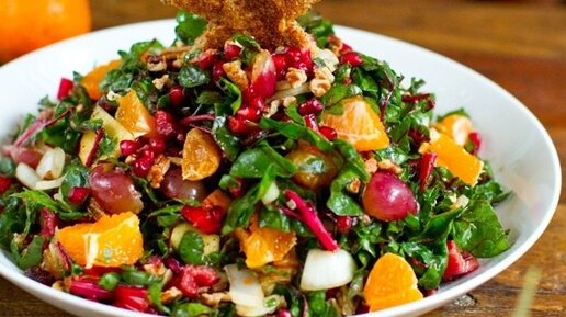 Нарезаем апельсин и яблоко крупными кусочками. Виноградинки и маслины делим пополам. Орехи измельчим и посыпаем салат. Дальше разделаем гранат и посыпаем его семенами все сверху...