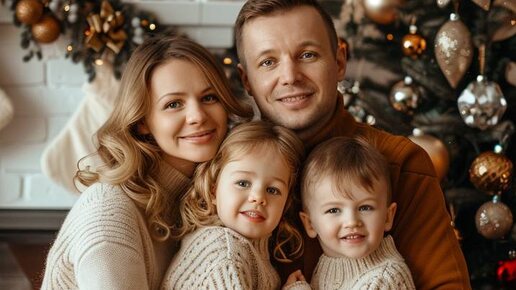 , аккуратная праздничная одежда (свитера крупной вязки, спокойные красно‑зелёно‑бежевые тона), мягкие живые эмоции, взгляд в камеру, фотореализм. Большая ёлка справа в кадре, золотые и красные игрушки, гирлянды тёплого белого света, на полу подарки в крафтовой бумаге с лентами, камин/свечи на фоне, лёгкое боке огоньков, мягкий «cinematic»...