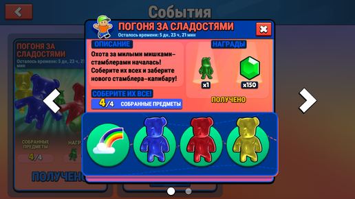 Итак, всем привет, сегодня я выпускаю свой первый пост, и он будет посвящен скину желе-капибары в игре Stumble Guys Думаю, каждый, кто играет в Stumble Guys сейчас, видел такую акцию (на фото выше) что, если вы соберете одну эмоцию радуги и 3 скина желе-мишек (Синего, Желтого и Красного) то вы получаете скин желе-капибары и +150 самоцветов (Что не особо много, скин интересует нас побольше) и так, сейчас я расскажу, где или как можно получить этот ОЧЕНЬ красивый и прикольный скин (Я его уже получил...