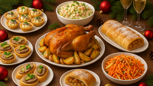 Бюджетный новогодний стол 2026: меню на 5–6 человек всего за 2000 ₽! 2 закуски, 2 салата, горячее и десерт!