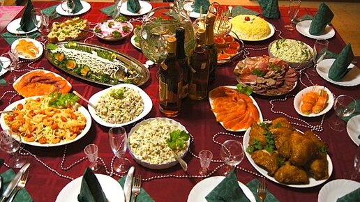 Новогодний стол с разнообразными блюдами