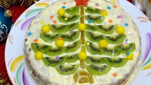 Торт "Елочка" с киви, бананом и зефиром, в сочетании с масляно-сметанным кремом хорошо пропитывается, получается очень нежным с изумительным вкусом. Если вы заранее позаботитесь о покупке готовых коржей (они продаются в продуктовых магазинах) и других ингредиентов, то сделать торт к Новогоднему столу не составит большого труда, так как готовится он быстро минут за 40. И вам не придется тратить 1-2 часа только для приготовления бисквитных коржей. Да и крем готовится за считанные минуты. Приготовив такой тортик к праздничному столу, Вы приятно удивите своих близких и гостей необычной "Елочкой"...