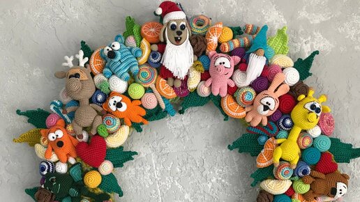 Или история о том, как мне сделали очень интересный заказ. В сентябре мне написала знакомая, что хочет венок из игрушек, прислала фото примера, но там был венок с летним декором в виде птиц, фруктов и зелени. Мне же предлагалось сделать что угодно на мой вкус, но с игрушками и красивое - самый лучший вариант работы на свете! Начала вязать я с игрушек. Пыталась сделать эскиз для себя, но ни один мне не понравился, увы. Поэтому сначала было просто вот так Потихонечку игрушек становилось больше Потом...