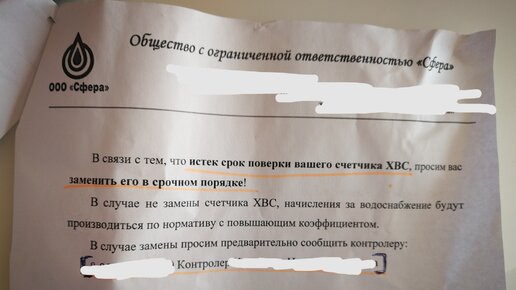 Этот материал пришел на почту канала. Я решил оставить его без изменений, потому что рассказанная в письме история довольно типична. От себя лишь отмечу, что собственникам жилья всегда надо помнить: требования управляющих организаций всегда надо сверять с законом. Вы также можете присылать для публикации на канале свои истории о защите прав в ЖКХ. Моя почта: zhkhvopros@yandex.ru. С очередной ежемесячной квитанцией пришла мне бумага (не пожалели пол странички и даже степлером прикрепили). Мол, надо заменить счетчик водный, потому что у него истек срок поверки...