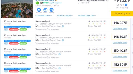 Спрос на зарубежный отдых в период новогодних праздников в этом году не такой уж и высокий, поэтому цены особо и не поднимаются. Вполне реально купить путевку на двоих для встречи Нового 2024 года за 146 т.р., это с прямым перелетом из Москвы до кубинского острова Кайо-Коко и далее трансфер до Санта Лусия, отель 4* на олл инклюзиве, на 7 ночей Ручная кладь 10 кг, багаж столько же. Лететь 14 часов, кормят один раз, но можно добавить заранее за отдельную плату. На самом острове Кай--Коко, цены начинаются от 160 т...