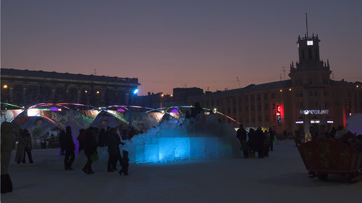 Вчера выкладывал "новогоднюю архитектуру" от 2009 года, а сегодня прошлогодняя, снятая 1 января 2019 года, там же на площади Советов в городе Кемерово... Тот же Ленин, то же здание администрации, та же искуственная ёлка... Ещё не за 18 миллионов... Правда работникам администрации, наконец-то окна открыли, пусть смотрят на площадь!!! А не на завешенное баннерами окно, например на глобус Кемерово, вон он на следующем кадре за нулевым километром, слева: Надпись с новым годом, и дед мороз со снегуркой:...