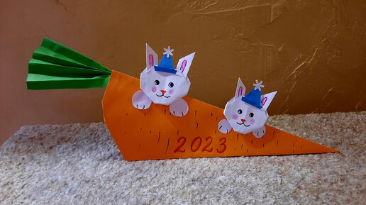 Оригами малышам Всем уже известно, что будущий год будет годом Кролика. Как задобрить Кролика, чтобы он был всем доволен и добр к нам? Дать ему очень большую морковку))) Такую простую, но оригинальную новогоднюю открытку с большой морковкой смогут сделать самые маленькие мастера, если вы им немного поможете) Нужна цветная офисная бумага и клей. Для морковки я приготовила квадрат из листа формата А4 (это 21Х21 кв.см). На самом деле, можно взять и поменьше. Но хочу, чтобы у моих Кроликов была большая морковка))) Для морковного хвостика - 1/8 от А4 (примерно 10Х7 кв...