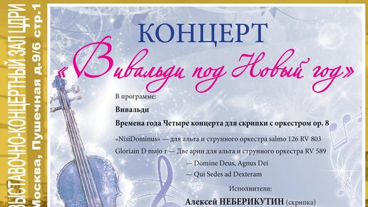 Выставочно-концертный зал Центрального Дома работников искусств Концерт «Вивальди под Новый год» Как справиться с грустью, провожая Старый год? Вспомнить сугробы и зимнюю стужу, или искрящееся море и летний зной, или осеннее увядание природы, или, наконец, всегда радующую новую весну? Бокал шампанского в руке и легкая ностальгия по ушедшему времени… Но лучше всего, если прозвучит музыка! Сверкающий Вивальди, чья музыка всегда будоражит кровь и вселяет надежду на лучшее!...