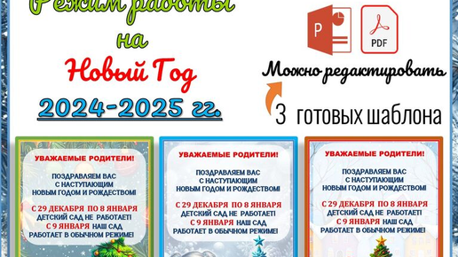 3 готовых объявления для родителей в ДОУ о режиме работы в Новогодние праздники. Можно отредактировать для школы. Просто распечатать готовый файл( шаблон) pdf или самостоятельно написать ( отредактировать) объявление ( во вложении редактируемый файл pptx/презентация PowerPoint). ИспользуЮтся шрифты : Аrial Black , Cambria, Dudka. Дополнительно: Рабочие листы пополняются новыми разработками. Рабочие листы Литературное чтение 1 класс кликните здесь Рабочие листы Литературное чтение...