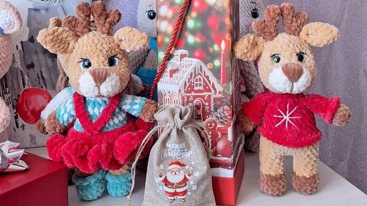 Сегодня Рождество и я связала оленяшек. Мальчика и девочку. У девочки юбочка съёмная.