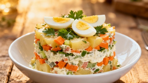 Салат Оливье — это не просто блюдо, это символ праздника! Готовится легко, получается красиво и нравится буквально всем. На праздник, на обед или просто так — этот салат всегда выручит. Время на приготовление: 30 минут (+ охлаждение) Сложность: очень простая На выходе: 6-8 порций Пищевая ценность (примерно на 1 порцию из 8): Для салата: Шаг 1. Варим картофель, морковь и яйца В кастрюлю положите картофель и морковь, залейте холодной водой, доведите до кипения и варите 15-20 минут. За 5 минут до готовности картофеля добавьте яйца...