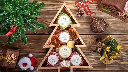 Наборы чая, меда, варенья, специй, орехов в деревянных коробках на Новый год