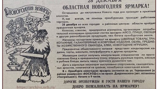 Найти подходящий подарок — задача не из легких во все времена, поэтому оренбургские газета на XX веке уделяли особое внимание праздничным объявлениям и рекламе. На страницах можно было найти все: от последних новостей до увлекательных объявлений о новогодних базарах и предпраздничных ярмарках. Редакторы собирали информацию о местах, где горожане могли приобрести подарки и праздничные товары.