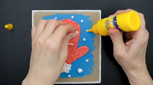 Сегодня сделаем зимнюю открытку, уютную такую, с тёплой яркой варежкой. Нет, это не будет имитация вязки из полимерной глины или пластилина. Нашу хранительницу тепла мы сплетём из обычных бумажных салфеток. Начнём с этих самых салфеток. Если у вас есть яркие салфетки можете смело пропустить этот шаг. У меня кончились. Я тут ёлку из них делала, много ушло. Поэтому решила окрасить несколько салфеток про запас. Процесс сфотографировала, листайте галерею (4 фото). Пока наши салфетки сохнут, сделаем основание для открытки...