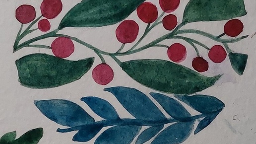 Нарисуем небольшую новогоднюю открытку с композицией из ёлочных игрушек. Вторая (правая верхняя) часть композиции будет состоять из классического ёлочного шара. 1. Для наброска обозначим границы шара в виде круга и крепление. 2. Сделаем три горизонтальные линии, которые будут определять рисунок шара. Эти линии в последствие будут веточками. 3. К веткам добавим листочков разных размеров: центральная ветка будет иметь наиболее крупные листочки, ветки, расположенные сверху и снизу, будут с более мелкими листочками...