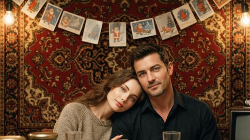 Модель: Nano Banana Сгенерировать🪄 Используй лица мужчины и женщины с загруженного фото. Эталонное изображение: концептуальный вариант. Теплый ностальгический ретро-портрет молодой пары, сидящей рядом за праздничным обеденным столом в советском стиле. Девушка нежно склоняет голову на плечо парня, выглядя мягкой и любящей; ее рука легко лежит на его предплечье. Мальчик спокойно сидит рядом с ней, расслабленный, с едва заметной улыбкой. На заднем плане: на стене висит винтажный ковер с богатым рисунком, напоминающий об атмосфере квартиры 1980-1990–х годов...