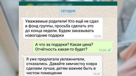 Наступление какого-либо праздника или события в детских садах и школах, как правило связано со сбором родительских денег на подарки. Именно в эти моменты и происходят скандалы и разборки на финансовой почве. Я расскажу 3 разных истории и 3 выхода из сложившейся проблемы. Хотелось бы узнать ваше мнение. 1. Это происходит сейчас в нашей группе детского сада. Все общение, как и всегда проходит в общем чате. С начала сентября большинство уже сдали деньги в общий фонд группы. Это деньги на которые покупаются подарки детям, воспитателям и осуществляются пр...
