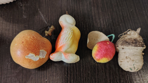 У меня сохранились три ёлочные игрушки из папье маше и одна ватная. Я не знаю откуда они, но они всегда лежали в коробке с другими елочными игрушками. На фоне блестящих, разноцветных игрушек, конечно они выглядят неказисто и устаревше, я всегда их браковала, отшвыривала и никогда не вешалка на ёлки, но выкинуть их у меня рука не поднималась. Думаю, что это игрушки 40-50г.еще моей бабушки. Игрушка ватный гриб, даже верёвочка, за которую подвешивали эту игрушку сохранилась родная. Это яблоко с листиком из папье маше...