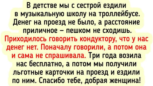 Бывают дни, когда все не то и все не так. С самого утра за окном серый снегодождь, кот снова раскидал землю из цветочного горшка по всей квартире, а начальник снова хочет что-то заоблачное прямо сейчас. В такие моменты спасает плед, вкусный чай и добрые истории, после которых снова расплываешься в улыбке. В детстве мы с сестрой ездили в музыкальную школу на троллейбусе. Денег на проезд не было, а расстояние приличное — пешком не сходишь. Приходилось говорить кондуктору, что у нас денег нет. Поначалу говорили, а потом она и сама не спрашивала...