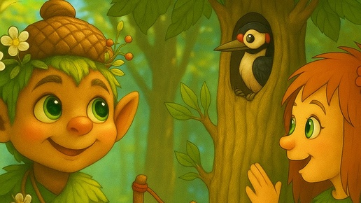 Солнышко только‑только поднялось, а Ярилка уж на ногах. Потянулся, улыбнулся и вприпрыжку побежал к ручью — там, у ивы плакучей, должна была ждать его Веснянка. Но на привычном месте никого не оказалось. Ярилка огляделся: — Веснянка! Ты где? Тишина. Лишь птицы перекликаются да ручей журчит. — Ладно, — вздохнул Ярилка, — подожду немного. А пока можно и потренироваться. Достал он свою верную рогатку, набрал жёлудей. А Мстикусь, что всегда был рядом с Ярилкой, ловко вскарабкался на ветку. Паучок зашевелил лапками — и вот уже первая шишка полетела вниз...