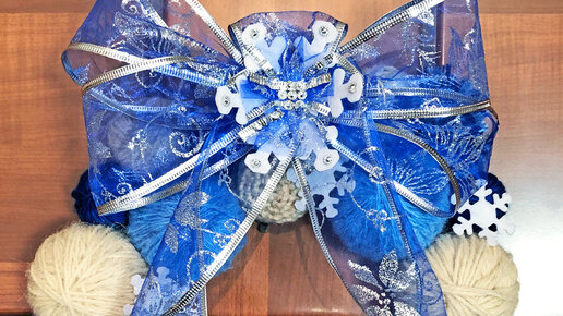 Увидев такую версию рождественского венка, я сразу же захотела его повторить, сделать свой вариант. Согласитесь, выглядит текстурно и ярко. У меня в венке четыре варианта шерстяных нитей: голубые, синие, белые и бежевые. Большая часть клубков - это намотанные шары, несколько вязаных, а ещё два помпона. Клубки формируются очень быстро. Для этого берем бумагу, сживаем её в шарик нужного размера и обматываем нитью. Вязаные шарики делаются крючком по простой схеме. Набираем три петли, соединяем, далее вяжем по кругу столбиком без накида...
