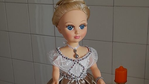Как красавица может всем сердцем полюбить чудовище, так и кукла Анастасия не прочь примерить на себя оригинальный рождественский образ – совсем не Белль, как вы могли подумать, а одного из самых колоритных персонажей знаменитого диснеевского мультфильма – канделябра Люмьера, бывшего до наложения на него заклятья метрдотелем. Необычная, на первый взгляд, аналогия выросла из цветовой гаммы праздничного наряда, сшитого из плотного тяжёлого атласного шёлка приглушённого оттенка золота (основа подсвечника)...