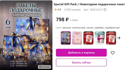 Одно дело, найти подарки, другое - красиво и оригинально их упаковать. Если хотите удивить друзей и близких, то эта подборка вам поможет 1. Новогодние подарочные пакеты Оригинальный элегантный набор подарочных пакетов для подарков, сладостей, конфет, сувениров и угощений. Включает в себя шесть пакетов, каждый из которых украшен красивым принтом, создающими праздничное настроение. Арт: 184216312 2. Подарочная коробка Подарочная коробка – лучшая упаковка для любого подарка на любой праздник и повод...
