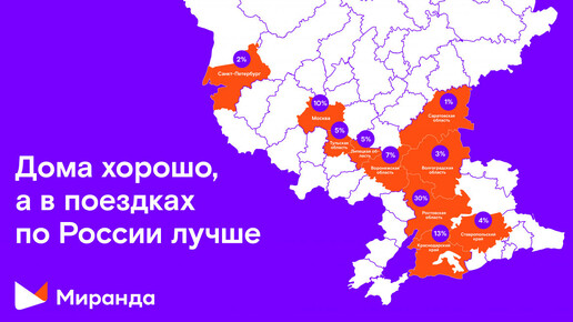 ГК «Миранда-медиа» (далее – «Миранда»), оператор цифровых услуг федерального уровня, провела анализ обезличенных данных о поездках своих абонентов по России на январских праздниках и определила топ-10 наиболее востребованных регионов. Исследование показало высокую мобильность в период новогодних праздников. Благодаря качественному покрытию и стабильной работе сети по всей России абоненты «Миранды», выезжающие за пределы Крыма и исторических территорий, оставались на связи с близкими.