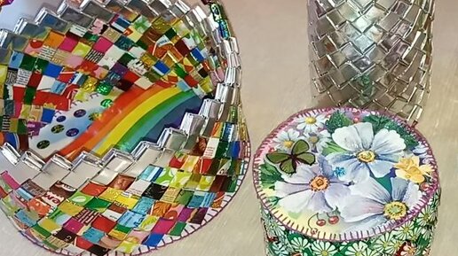 Материалы для рукоделия, о которых почти все забыли: фантики от конфет. Да-да, фантики. В бывшем СССР, между прочим, конфетные обертки были в ходу. Почему бы не вспомнить этот замечательный материал, методы его переработки, возродить забытое рукоделие в своих поделках. Тем более, что это абсолютно точно очень понравится детям. Делаем? Делаем! Посмотрите на фотографию выше: шкатулка, корзинка и ваза. Все они сделаны одним способом плетения автором канала «РАДУГА РУКОДЕЛИЯ». Вы тоже можете попробовать свои силы, если подкопите необходимое количество оберток...
