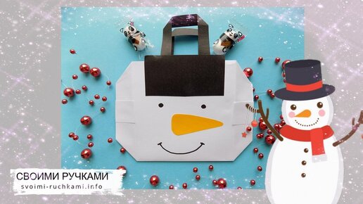 У многих детей Новый год ассоциируется с елкой и подарками. Если говорить о сладких сюрпризах, то их можно красиво подарить, сделав оригинальную упаковку своими руками. Например, положите сладости в сумочку в виде снеговика, представленную в этом мастер-классе. Фото 1. Для создания такой новогодней сумочки мы приготовили:- бумагу белого, черного и оранжевого цвета;- черный маркер;- клей;- ножницы. Фото 2. Сама сумка будет выполнена из белой бумаги. Для нашей поделки мы будем использовать половину листа А4...