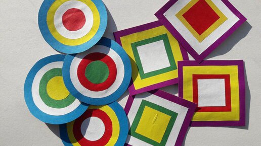 Понадобится: Вырезаем из картона квадрат 10 на 10см. И из цветной бумаги ещё 3 квадрата, каждый меньше предыдущего и все разных цветов.На квадрат основы приклеиваем цветные квадраты в порядке уменьшения.