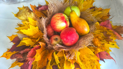 Покажу, как мы делали поделку в садик — вдруг кому пригодится, чтобы не ломать голову, что бы такое придумать. Ничего сложного: нужен клеевой пистолет и клей ПВА (желательно оба), а ещё коробка от печенья, много листьев и яблочки. У нас ещё в ход пошла мешковина, но можно наверно и пергамент или вообще без отделки коробки. Перед вами — наша поделка в садик. Ну, официально написано будет: «Сделано Марком, 5 лет». Но естественно, и мы все это понимаем, что всё это совместная работа (90% на 10%): 🧺 Корзинку мы сделали из коробки из под печенья — это заготовка...
