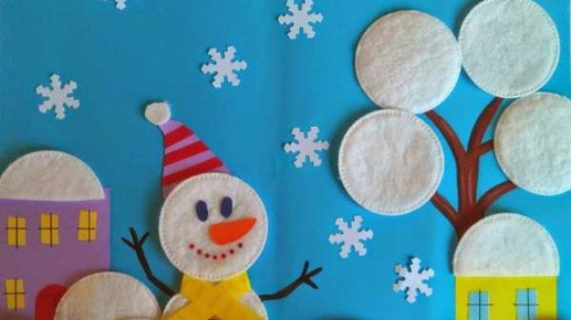 Зимние поделки в детский сад на новый год. Аппликация из цветной бумаги и ватных дисков.