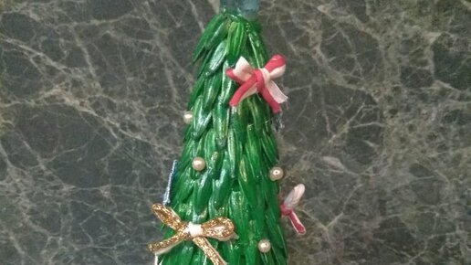 Первым делом приготовим необходимый материал. Нам понадобится: Далее делаем конус из картона. Обрезаем края конуса, чтобы он ровно стоял. Наносим небольшое количество клея на получившийся конус, прикладываем одну семечку на него и держим пока она не приклеится. Начинать приклеивать семечки лучше снизу, так удобнее и тогда низ нашей ёлочки получился ровным. Аналогично приклеиваем остальные семечки до самого верху. Когда Вы полностью обклеили конус, можно приступать с покраске. Если Вы выбрали баллончик, то лучше всего это делать на улице...