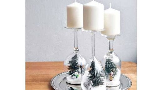 Отличная идея, когда нужен эффектный декор из подручных материалов. Мне очень нравятся широкие свечи. Они придают статность и величие любой композиции, даже самой простенькой. Помимо свечек и бокалов для создания таких подсвечников понадобится картонный лист, пистолет с горячим клеем, декоративные элементы (пластиковые деревья, веточки, фигурки и т.д.) и обычный сахар, исполняющий роль снега. Процесс изготовления прост до безобразия: 1...