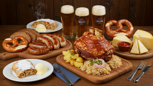 Национальная немецкая кухня: традиционные блюда Германии, немецкие колбасы, баварская кухня, десерты, пиво и рецепты для дома. Национальная немецкая кухня - это не просто набор блюд. Это часть культуры, отражение истории и уклада жизни народа. Вкусный домашний хлеб, ароматные сосиски, сочная свиная рулька, аппетитные картофельные блюда и, конечно же, нежнейший яблочный штрудель, всё это символы гастрономии Германии. Немцы всегда ценили сытность и простоту: их еда должна была насыщать, давать силы и радовать семью...