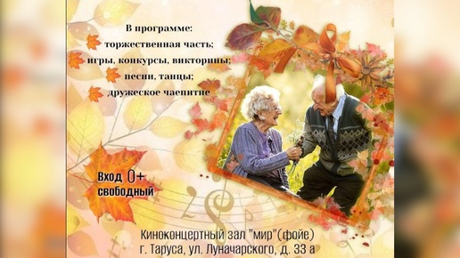 🎉 Дорогие наши ветераны и уважаемые представители старшего поколения! Приглашаем вас принять участие в праздничном мероприятии, посвященном Дню пожилого человека "Нам года — не беда"! 🕒 Ждем вас 3 октября в 15:00 часов в киноконцертном зале «Мир». Но на этом праздник не заканчивается. Мероприятия для тарусян серебряного возраста будут проходить в течение месяца...