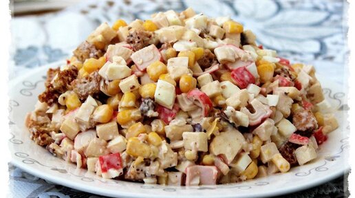 Несмотря на то, что традиционно салаты готовят на праздничный стол, иногда хочется нарушить это правило и устроить праздник посреди недели. А если этот салат состоит из легкодоступных ингредиентов и прост в приготовлении, то это уже двойной праздник. Рецепт этого салата когда-то размещался на упаковке от сухариков "Кириешки". #8марта Ингредиенты: крабовые палочки , яйца , сухарики , яблоко среднее , грецкие орехи , кукуруза , майонез , соль по желанию Способ приготовления: Первым делом обжариваем кубики черного хлеба на сухой сковороде до хрустящей корочки...