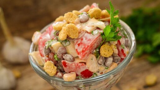 Ярко, вкусно, празднично! Салат с сухариками, консервированной фасолью и помидорами