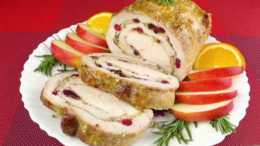 Взгляните на эту нарезку для праздничного стола. Яркая и аппетитная, с интересной начинкой. Использую сушенную клюкву и тонкие слайсы яблока, а главная скрипка - обычное куриное филе. Всё это заворачиваю в кусок свинины и запекаю...