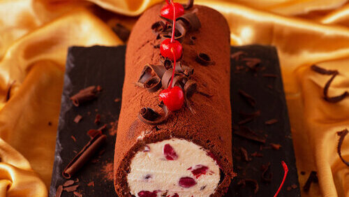 Шоколадный бисквитный рулет-мороженое с вишней на десерт к чаю. Готовим дома